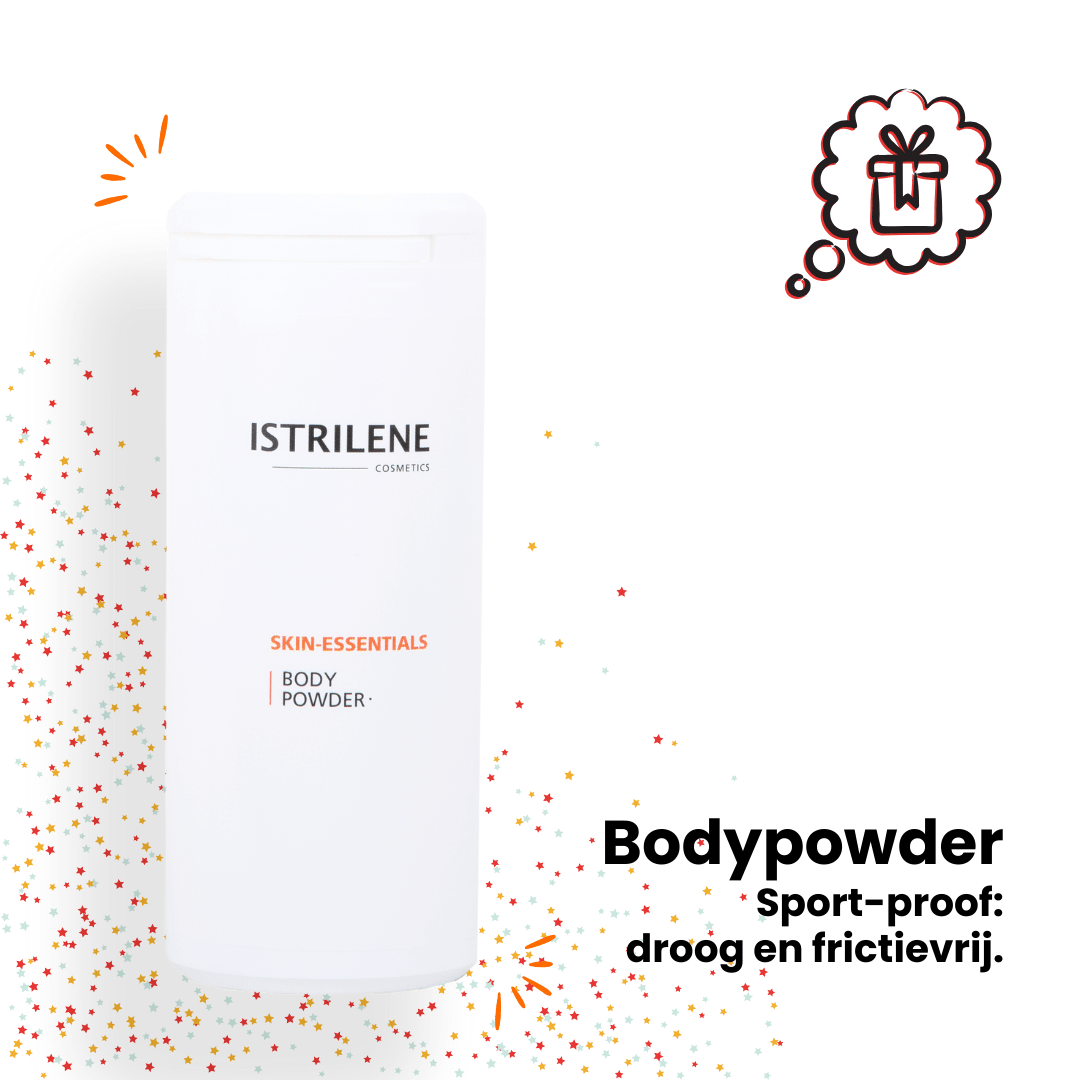 Zijdezacht comfortpoeder dat vocht absorbeert en wrijving vermindert in huidplooien – ideaal bij sporten, wandelen, warm weer of onder (sport)kleding.